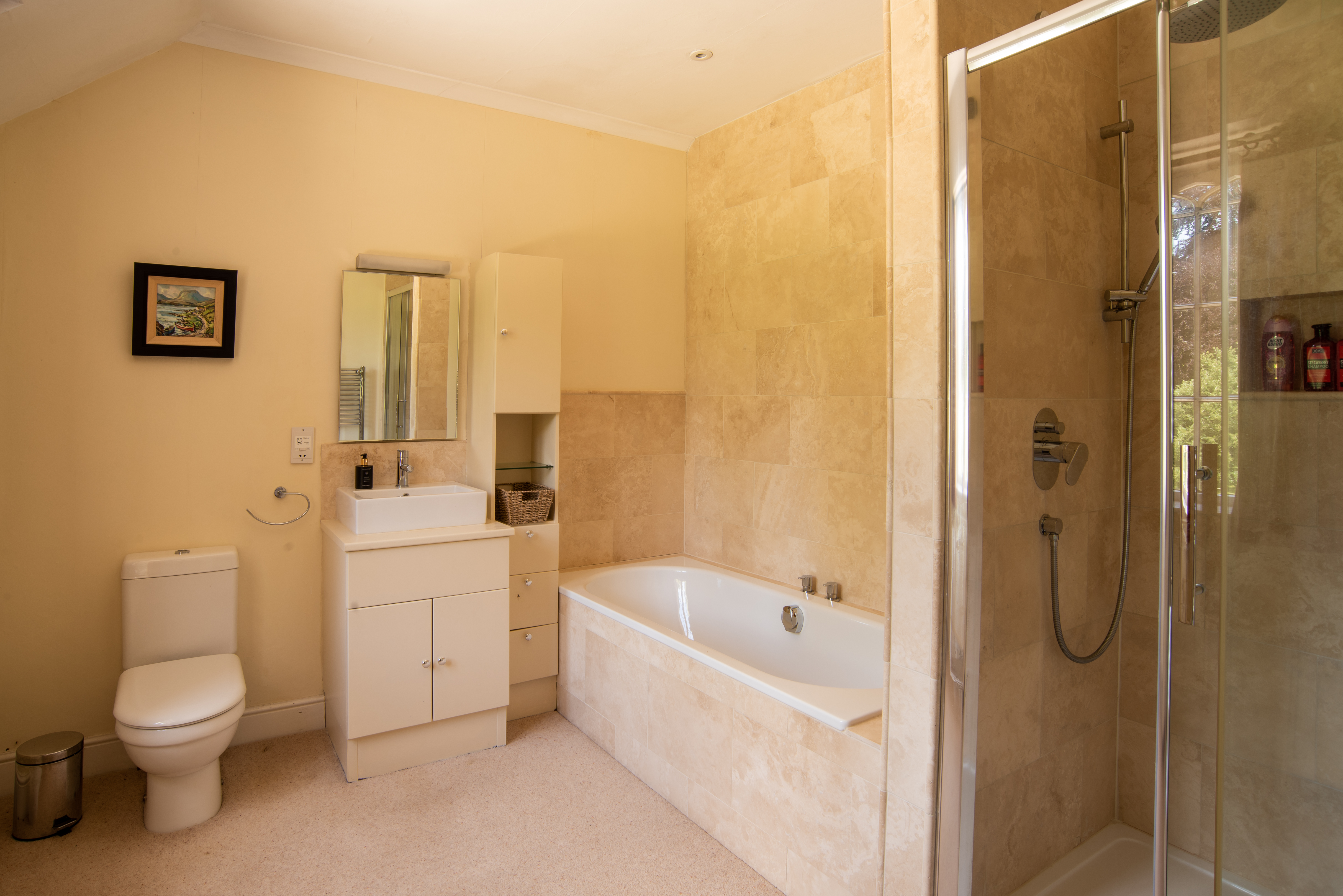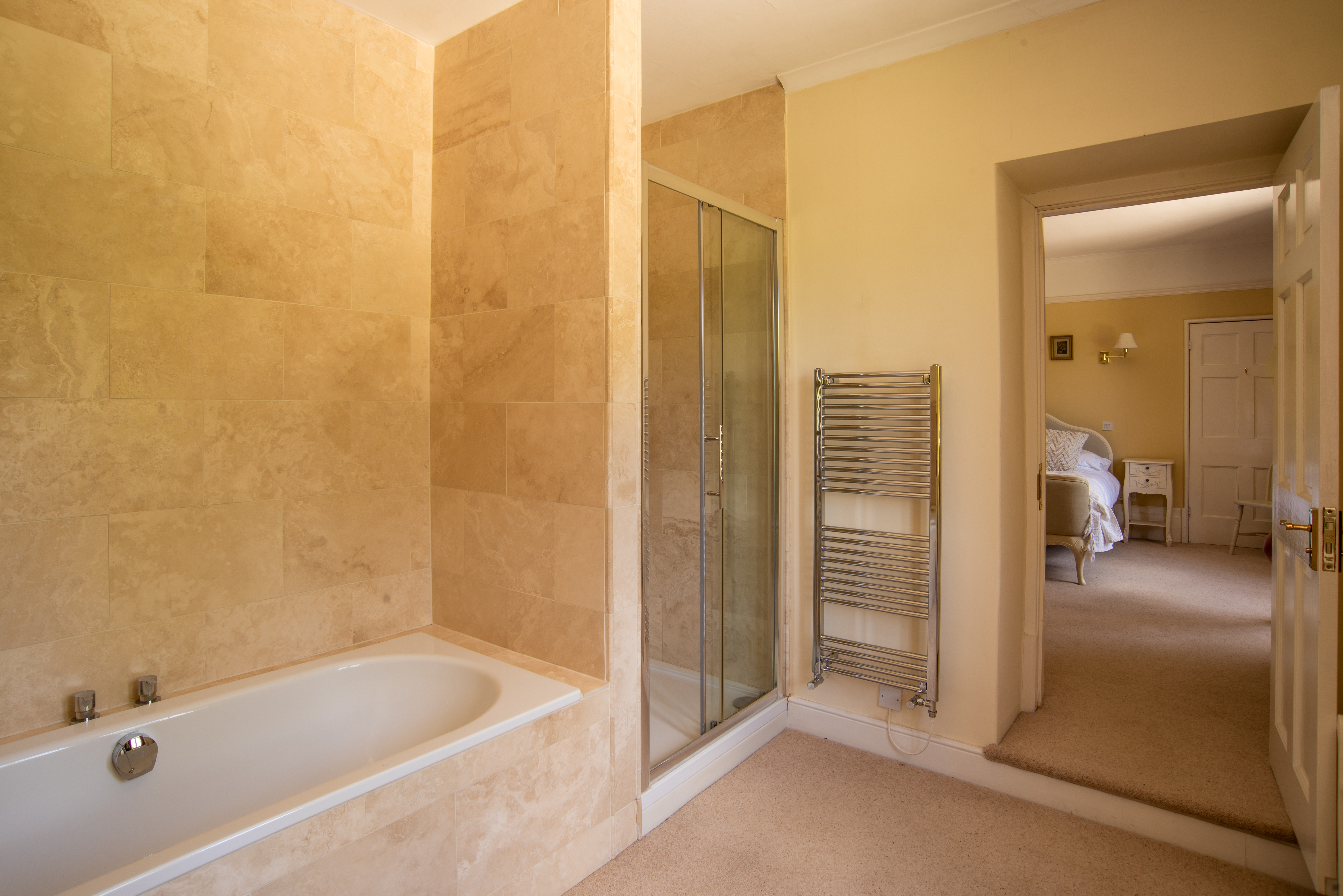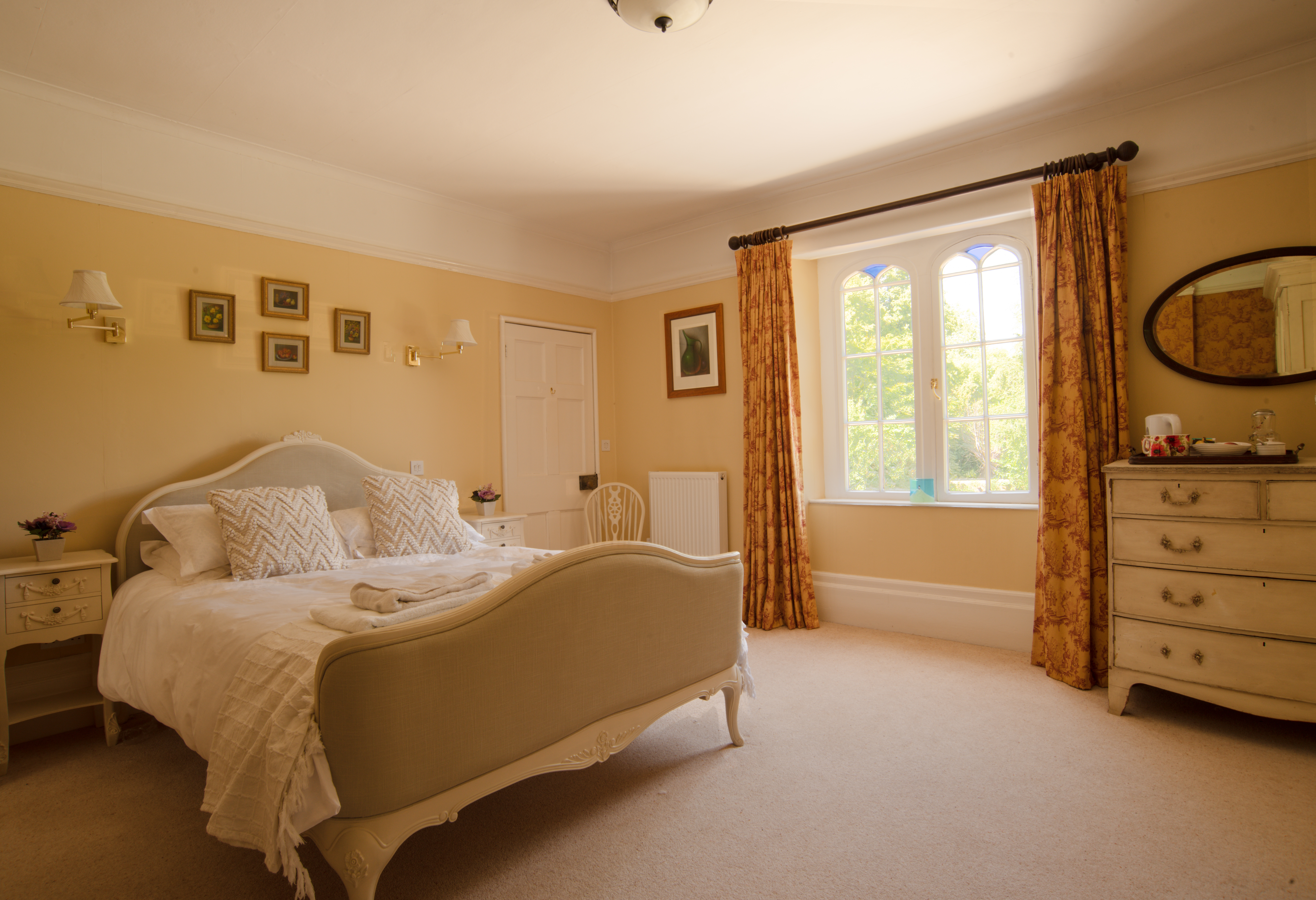 A spacious room with open views of the sweeping gravel drive, toward the village church and beyond. Large en suite with bath and walk in power shower.
